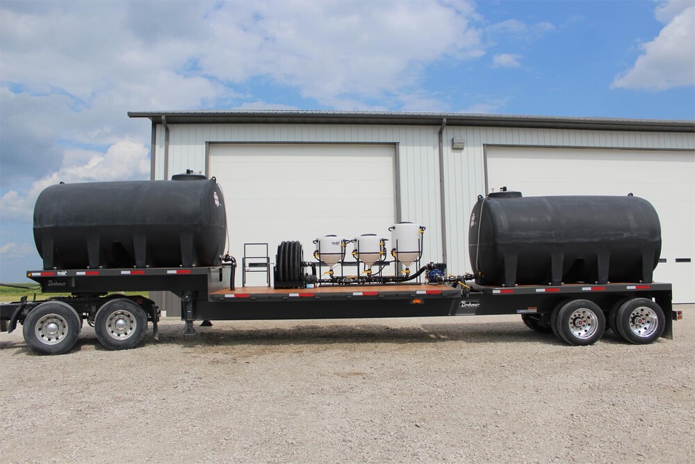 NURSE TRAILER, 45′ TANDEM AXLE, TAMDEM AXLE AMUMINUM RIM . 2-Enduraplas 2750gallon tanks 3” Fill, 3” Vanguard wet seal pump, 3” Hose reel, 1-65 Gallon, 2- 40 Gallon chemical eductors all have cone rinse and agitation, one has Jug rinse with 3” Venturie