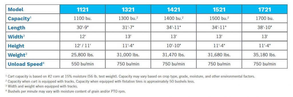 *Cart capacity is based on #2 corn at 15% moisture (56 lb. test weight). Capacity may vary based on crop type, grade, moisture, and other environmental factors. Bushels per minute may vary with moisture content of grain and/or PTO rpm.