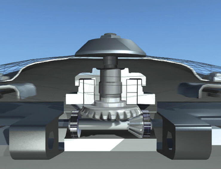 A heavy-duty cast gearbox transfers power from the right angle gearbox to the conditioners.