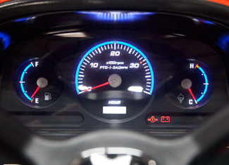 The dashboard illuminates when the engine is started. The digital gauge package includes tachometer, fuel and temperature gauges along with a low fuel warning lamp.