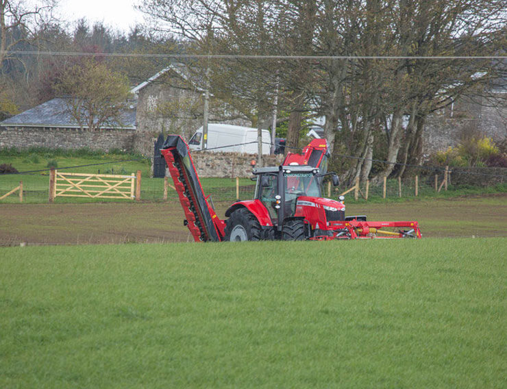 The rear mowers hydraulically fold up into a narrow, low profile transport position, allowing easy access to fields through narrow gates or on narrow roads where other mowers are too wide.