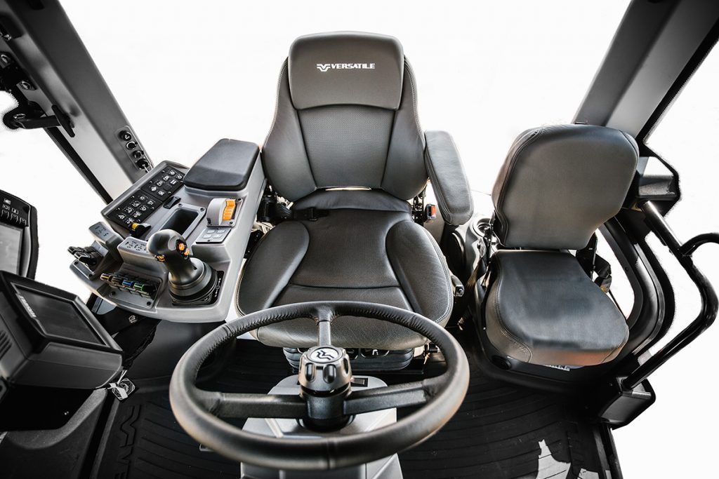 The Versatile four-wheel drives offer the largest cab in the industry, it has 85.9 sq. ft. (7.98 sq. m) of window glass. Additional standard cab features include a front and rear intermittent wiper/washer system, front and rear sun visors, four 12-volt outlets, four cup holders, and multi-directional vents.