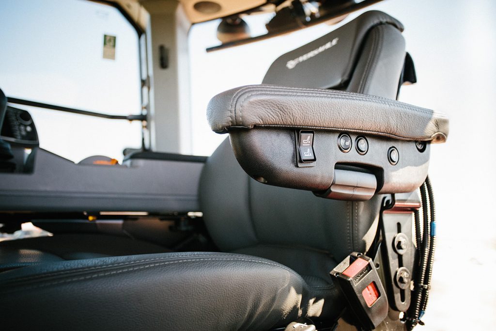The Deluxe Cab is a high-end full-featured cab that provides the operator with every imaginable comfort for long working days. A semi-active air-ride suspension seat and the training seat are both standard in this configuration. In addition to the connectivity options available in the standard cab, the Deluxe Cab has an 110v AC power outlet and a 5-volt integrated USB port. A subwoofer is also standard to improve sound quality in the cab.