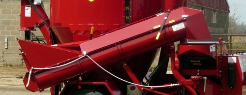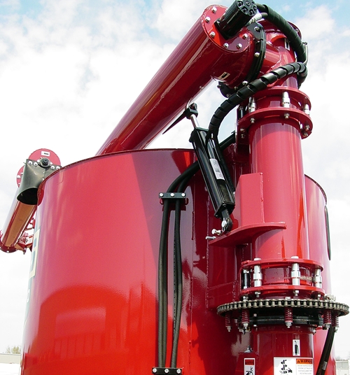 The 240 degree swing radius of the unloading auger allows repositioning of the discharge auger from one side of the machine to the other without moving the grinder-mixer.